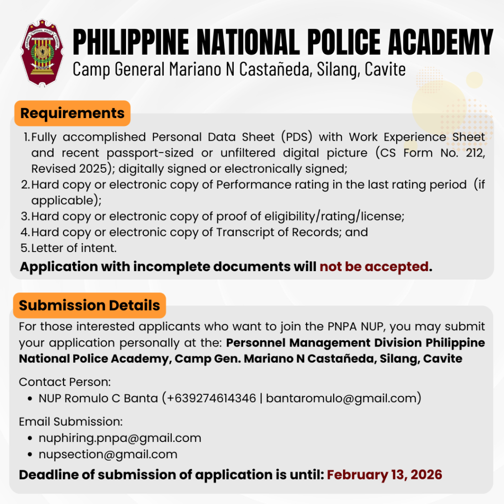 Hiring of Non-Uniformed Personnel is now open. For those interested applicants who want to join the PNPA NUP, you may submit your application personally at the Personnel Management Division, Philippine National Police Academy, Camp Gen. Mariano N Castaneda, Silang, Cavite and look for NUP Romulo C Banta (+639274614346 | bantaromulo@gmail.com) or NUP Maria Vanessa C De Jose.