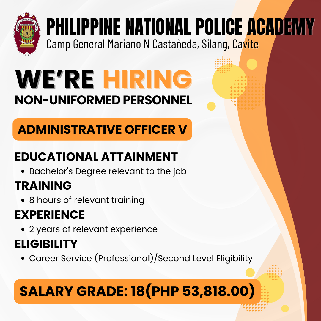 Hiring of Non-Uniformed Personnel is now open. For those interested applicants who want to join the PNPA NUP, you may submit your application personally at the Personnel Management Division, Philippine National Police Academy, Camp Gen. Mariano N Castaneda, Silang, Cavite and look for NUP Romulo C Banta (+639274614346 | bantaromulo@gmail.com) or NUP Maria Vanessa C De Jose.